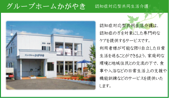 指定認知症対応型共同生活介護・介護予防指定認知症対応型共同生活介護 グループホームかがやき 〒071-8135 旭川市末広5条2丁目4番1号 TEL.(0166)55-6606 / FAX.(0166)55-6608 ホームの概要、サービス内容、ご利用料金等につきましてはパンフレット及び重要説明事項を ご覧下さい。 また、その他各種お問い合わせにつきましては、メールもしくは お手数ですが電話ご連絡にてお問い合わせ下さいませ