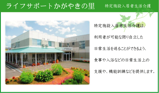 介護付有料老人ホーム:一般型特定施設入居者生活介護 ライフサポートかがやきの里 〒071-8135 旭川市末広5条2丁目3番1号 TEL.(0166)55-7000 / FAX.(0166)55-7007 ホームの概要、サービス内容、ご利用料金等につきましてはパンフレット及び重要説明事項を ご覧下さい。 また、その他各種お問い合わせにつきましては、メールもしくは お手数ですが電話ご連絡にてお問い合わせ下さいませ。